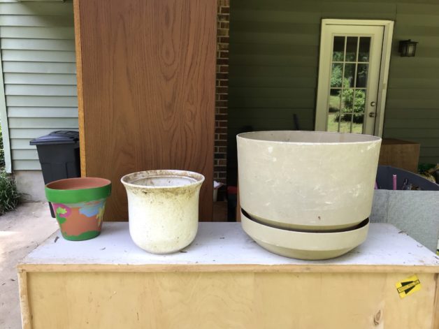 The plant is in a pot that I got from my Buy Nothing group; the pot was spattered with something that seemed almost like concrete, but with enough scrubbing, it came clean.