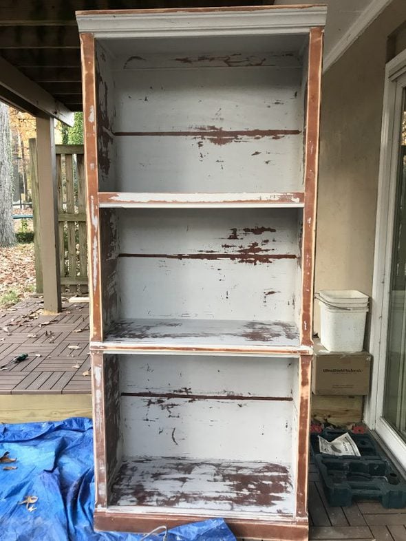 Mr. FG and I hauled the bookshelf into the backyard so I could start refinishing it.