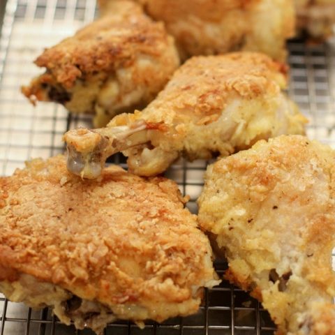 - Place chicken pieces, skin side up, on paper-towel-lined portion of wire rack, then move chicken to the unlined side. Let cool for 10 minutes before serving.