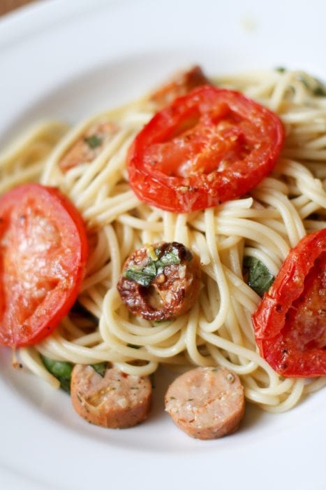 I tried a garlic spaghetti recipe from Dinner Illustrated. It was a vegetarian recipe, but I added in some Italian chicken sausages from Aldi (sliced and browned in a pan).