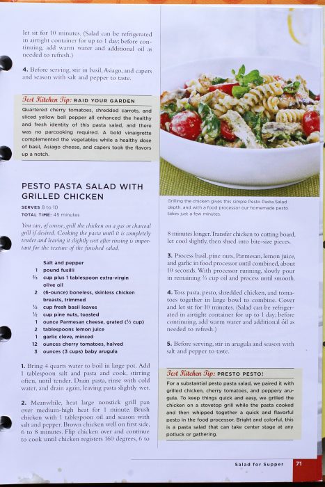 This is another recipe from my ATK Quick Family Cookbook. It’s a pasta salad dressed with homemade pesto, with tomatoes, arugula, and grilled chicken.