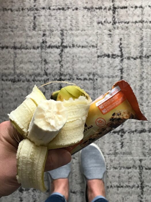 (bananas, trail mix, granola bars, and beef jerky)