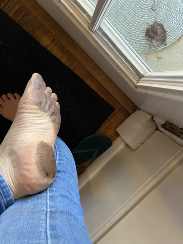 To put things away, I had to go into the basement room that we call the boiler room, and my feet got SO dirty.