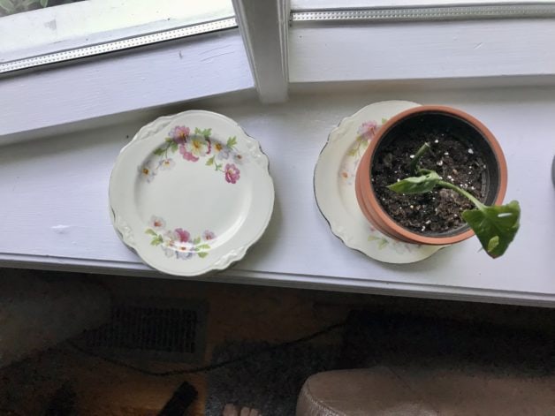 These four little flowered plates are probably way too old to be safe for eating off of (who knows what’s in the paint and glaze??), so when I realized this little pot needed a base, I grabbed one of them.