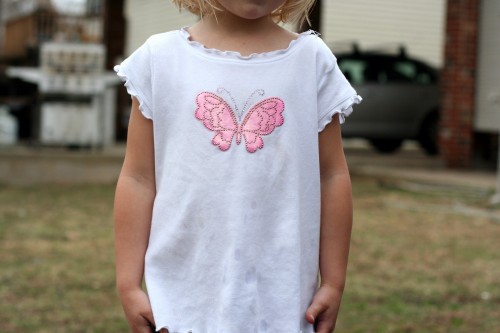 Thirdly, she got a sparkly butterfly shirt. She didn’t really need a new shirt, but she loves short sleeve shirts with sparkles on them. This cost me a whole $2.