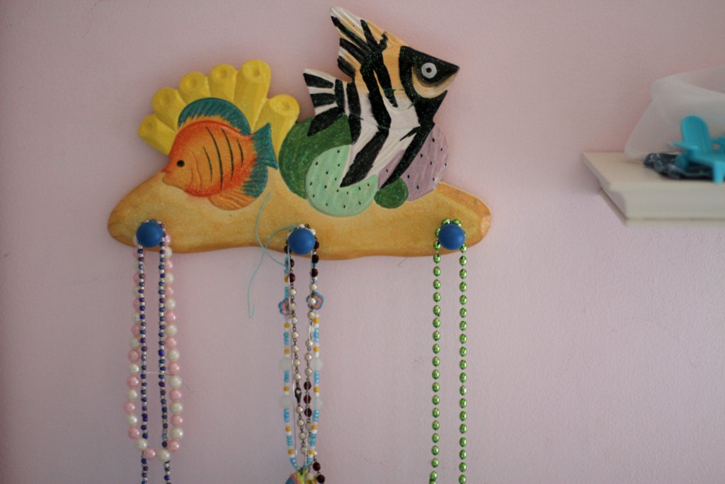 Now, I just need to find a wall hanger for my necklaces, and I’ll be all set. I’ve been faithfully keeping an eye out for one like I painted for Lisey and Sonia, but nothing has shown up at Goodwill yet except some terribly cheesy 1990s country-style stuff.