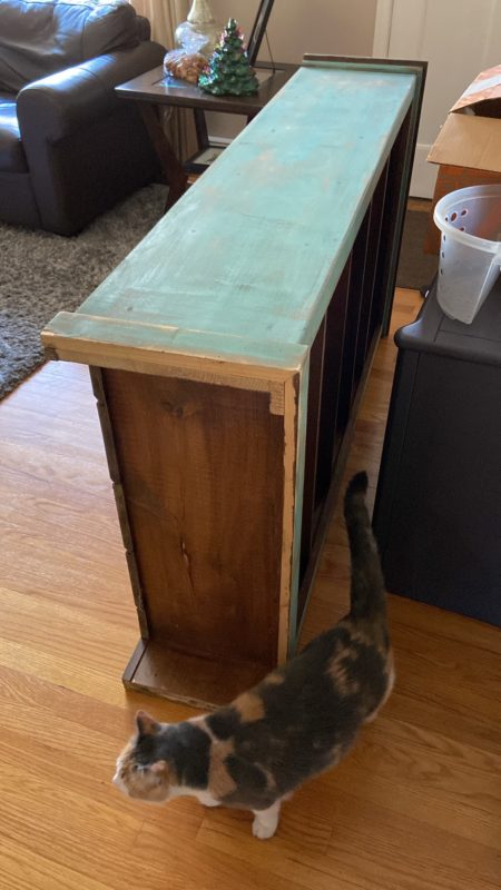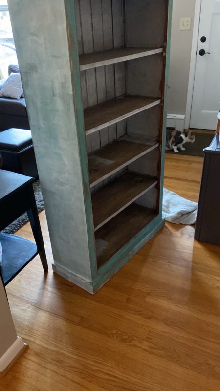 Eventually, I came across a teal solid wood bookshelf for $25, so I went to pick it up.