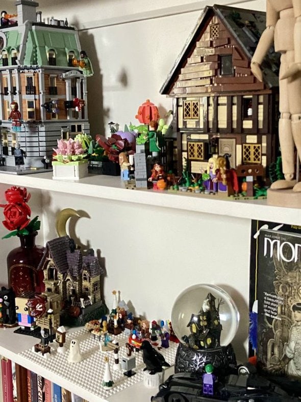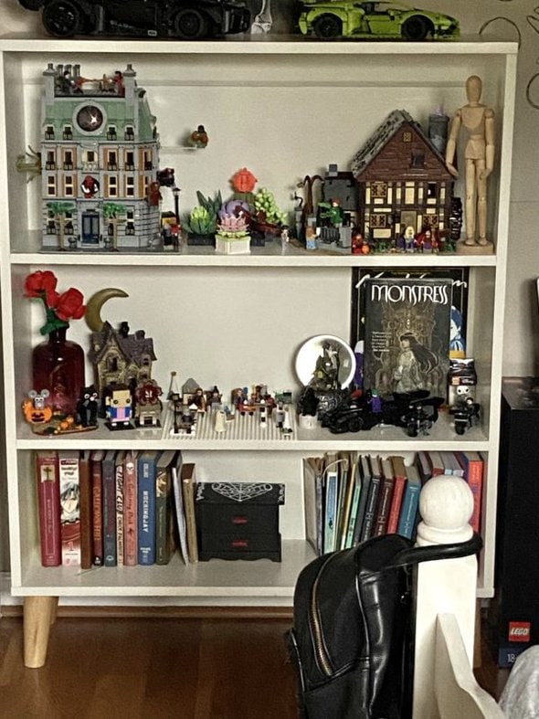 Anyway, I realized that since it’s upside down, the top two shelves are pretty tall and perfect for Legos.