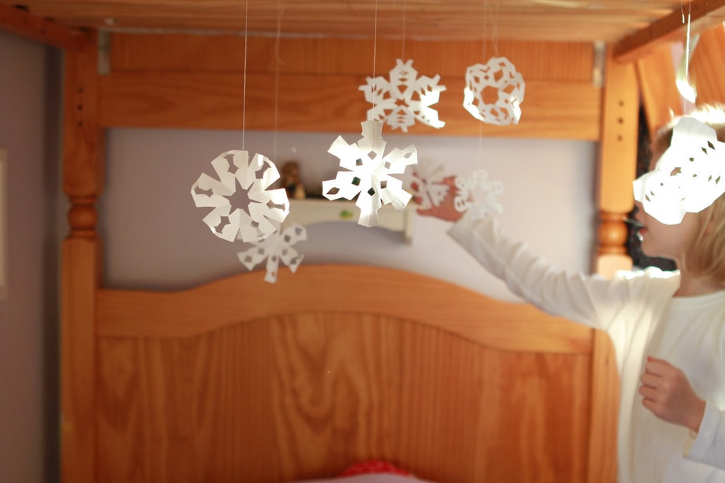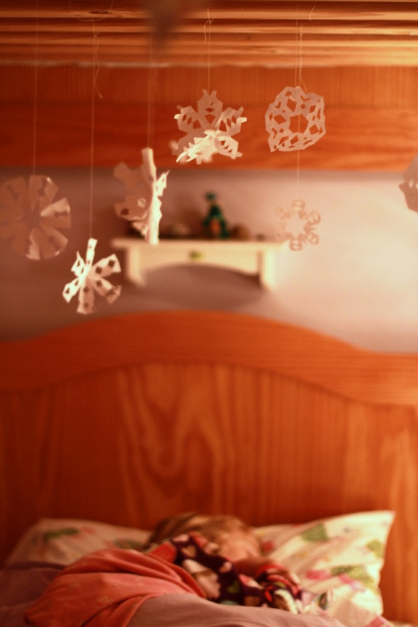 But we put the most above Sonia’s bed. The underside of the top bunk is made up of slats, and they’re perfect for suspending snowflakes.
