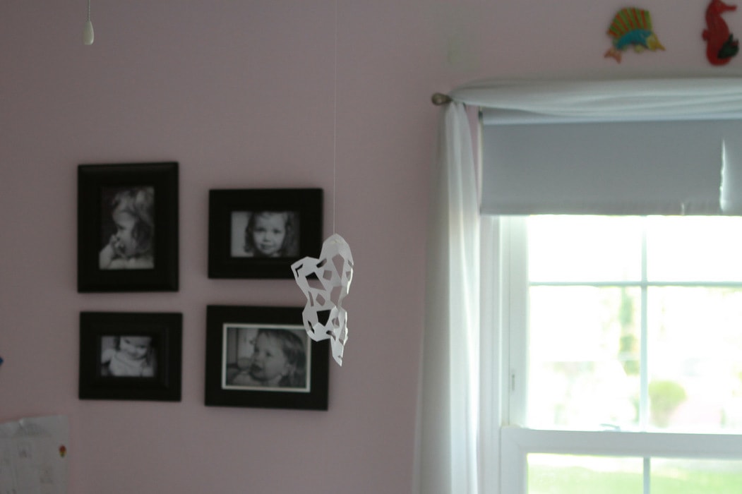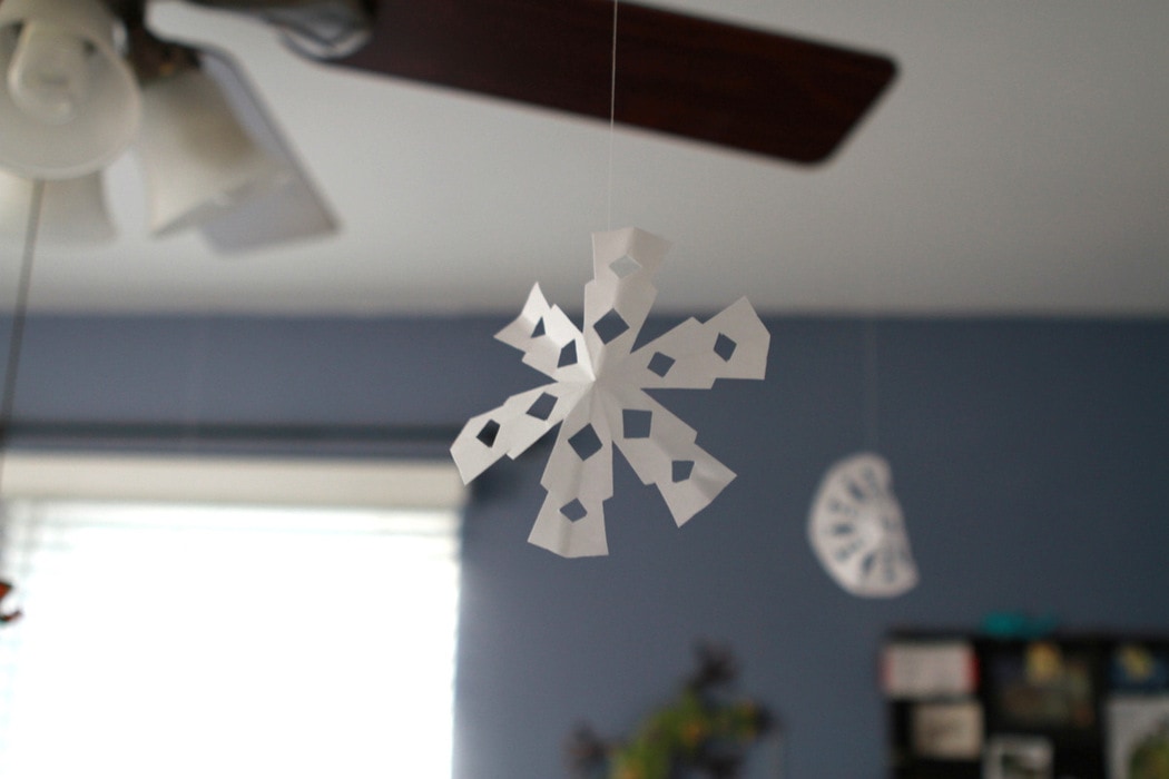 We taped cotton thread to our snowflakes and hung them from bedroom ceiling fan blades (we don’t turn these on in January usually!) in Joshua’s room: