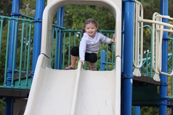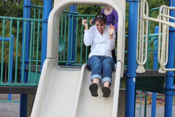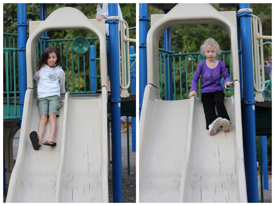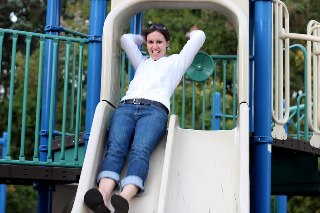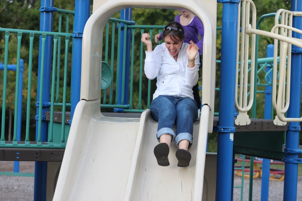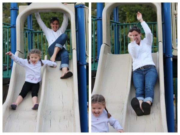 It’s very undignified of me, but I play a speed-sliding game with the girls, racing them to see who can get to and go down the slide the fastest.