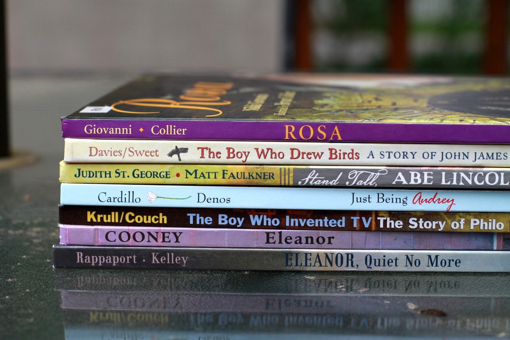 So, I look for biographies, but not just any biographies. I’m looking for ones with fun artwork and a colorful story…not the sort of book you’d dutifully check out while writing a paper on George Washington, but the kind you’d pick up and read just because you want to.