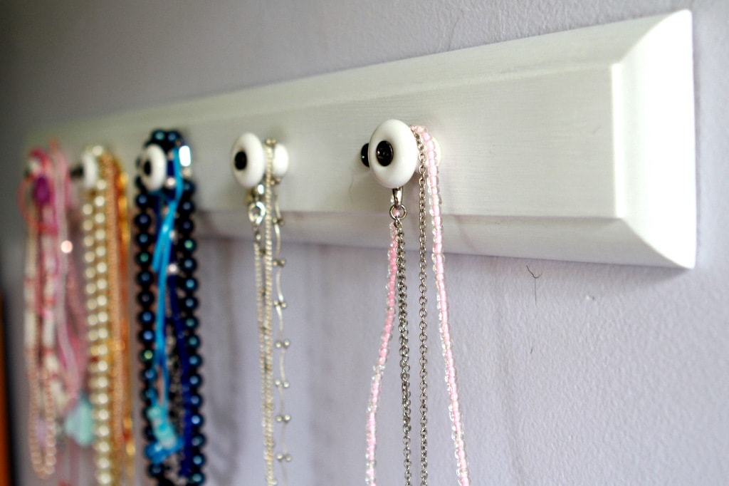 My sister-in-law shared an idea with me, which I now use and love! She uses push pins (the bigger plastic thumbtacks), which are wider at both ends so the necklaces stay put. Also, when you get a new necklace, just add another pin to the wall! So, I now have a line up of push-pins on my wall by my closet, each with a necklace on it. Nice and organized and super cheap!