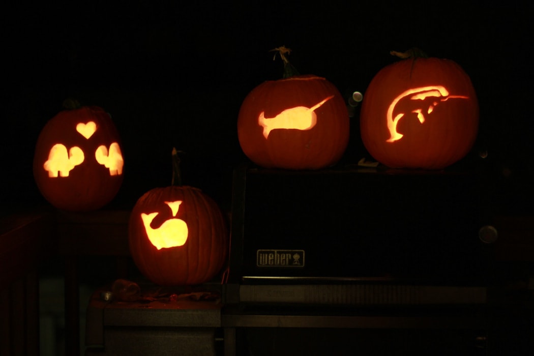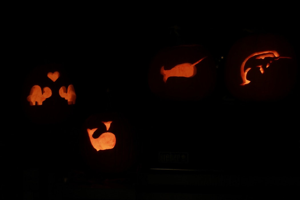 Joshua and Lisey’s pumpkins are both narwhals, so 3/4 of our pumpkins this year are sea creatures. Sonia’s pumpkin sports turtles, of course (I think the heart signifies that they’re in love.)