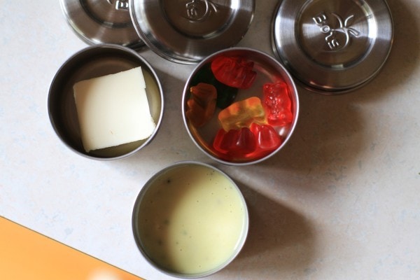 For items that need to be sent in really small quantities, I just bought some teensy stainless steel containers from LunchBots. These have a small silicone ring around the inside of the lid, so they’re leak-proof…yay!