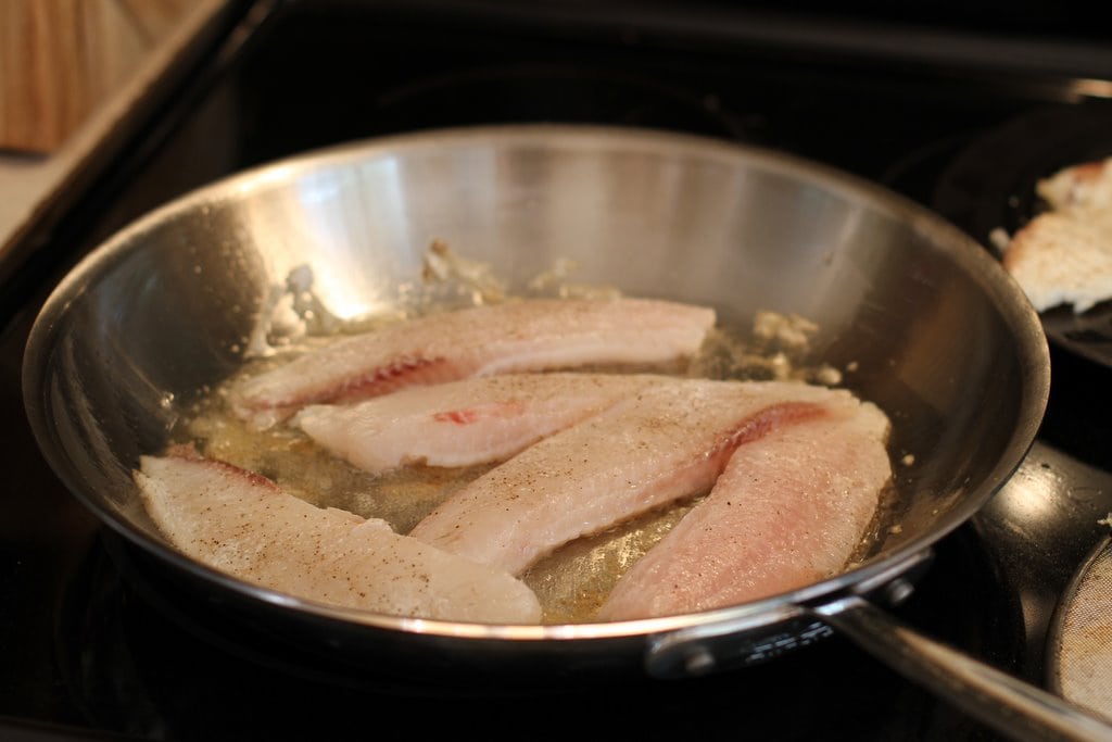 Heat a large skillet until it’s very hot and add 2 tablespoons vegetable oil, tilting to coat the surface of the pan. Add the fish and fry several minutes on each side until the fish is browned (the time this takes will vary depending on the thickness of your fish.)