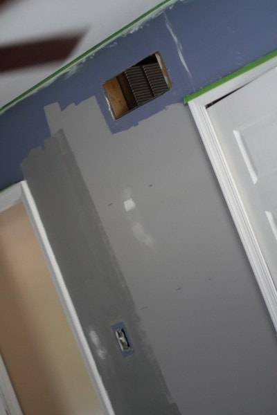 The paint is Behr Sparrow. We initially got a sample of this and a darker shade, and Joshua decided the lighter paint would look better.