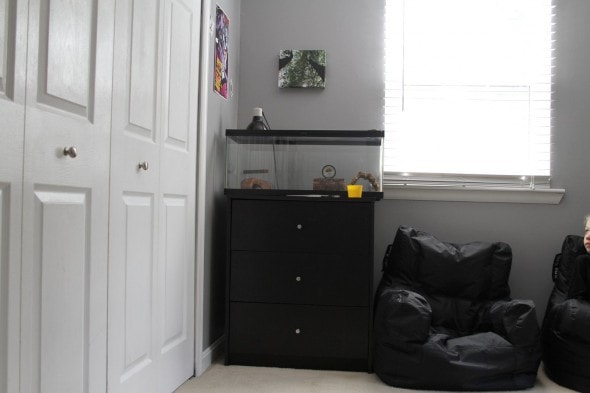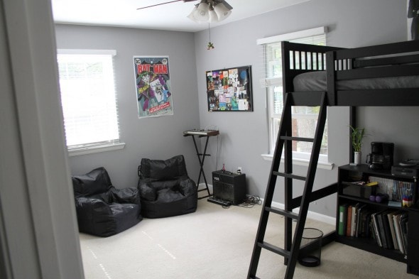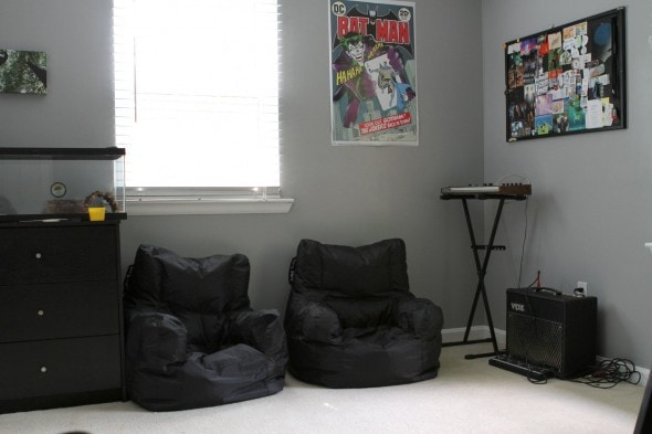 He’s saving up for a drum set purchase, and when that happens, the dresser will go at the foot of his bed, the beanbag chairs will scoot over, and this corner will house the drums.