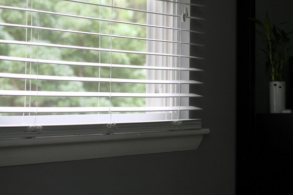 Joshua decided he would like to go without any window treatments (yay for simplicity!), so we just kept the faux wood blinds that we put in when we bought the house.