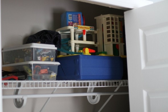 The pared-down collection now fits on the top shelf in his closet, leaving the bottom area free for his stuff.