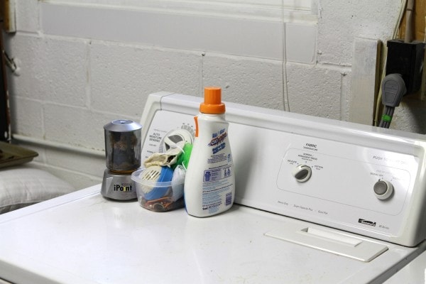 Fortunately for me, I have a top-loading washing machine (you remember it, right? From when I took it all apart?), so I can’t possibly stack any clutter up on there…I only have to deal with the dryer.