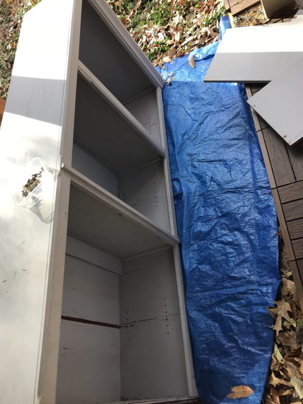 Mr. FG and I hauled the bookshelf into the backyard so I could start refinishing it.
