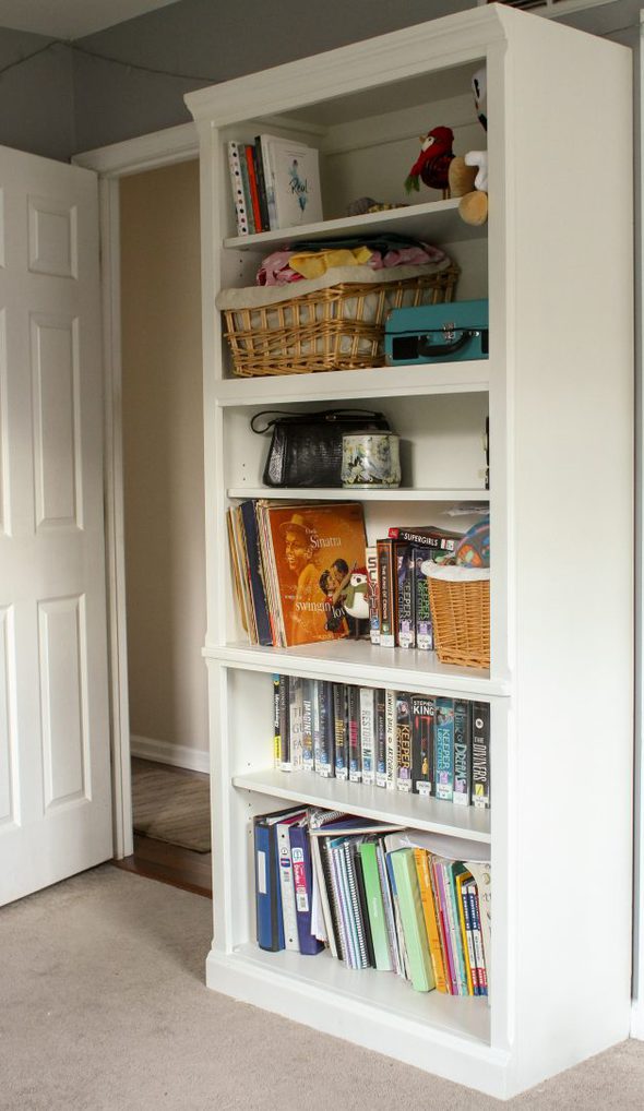 Anyway, I’d gotten her a Pottery Barn bookshelf (pictured above) off of craigslist a few years back, but it was a pretty small bookshelf and the shelf heights were not adjustable. That made it hard to store things like tall binders.