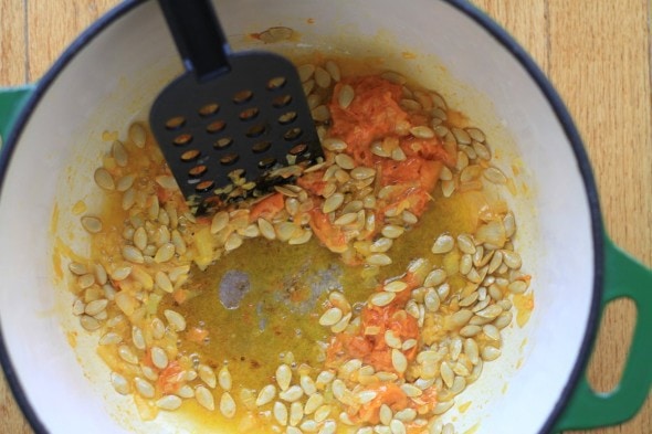 In a Dutch oven, saute the onion in four tablespoons of melted butter; then add the squash seeds and fibers, and saute them for several minutes.