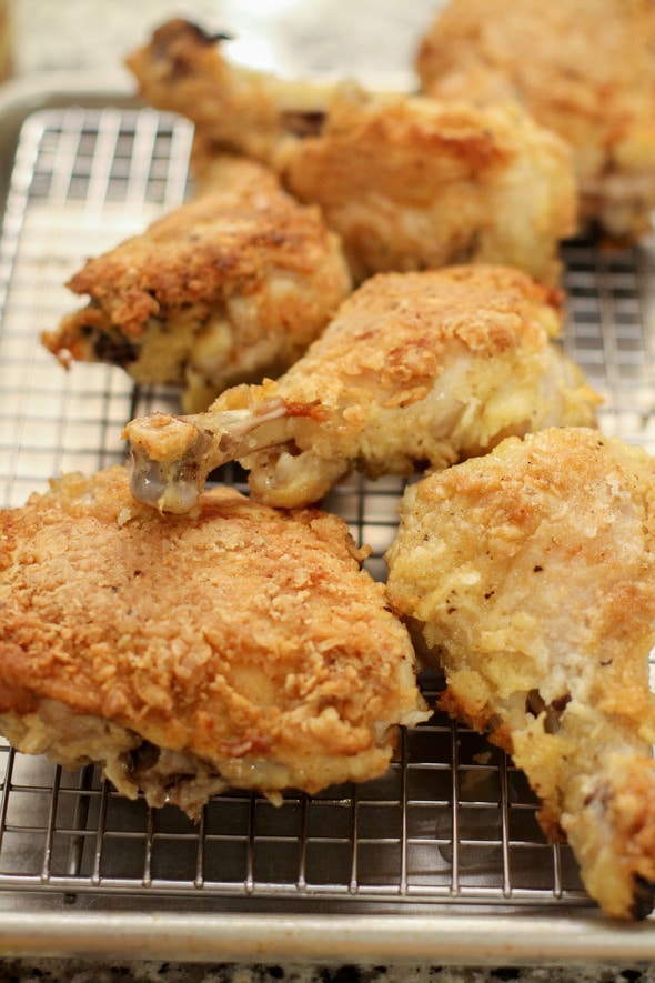 I think a key is that when you make the breading mixture, you add a little water and rub it into the flour with your fingers, creating some shaggy pieces that mimic the breading on real fried chicken. So genius!