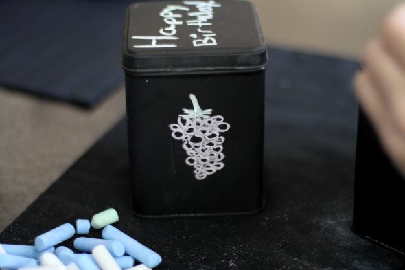 We haven’t drawn on/wiped off these tins too many times yet, so the jury is still out on how well the chalkboard paint holds up.