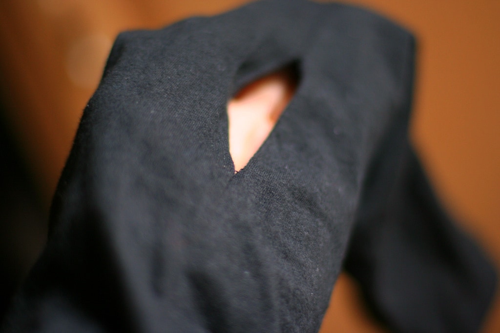 Black shirt: Purchased at Goodwill for $2.99 with a hole in the seam, then mended.