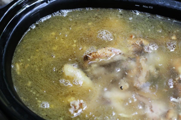 I had three rotisserie chicken carcasses to use and I opted to pull out my slow-cooker for the broth-making process.