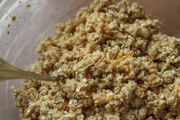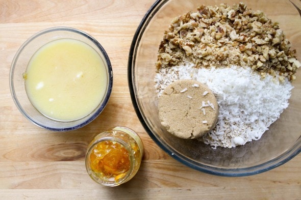 This is everything you need…melted butter, orange marmalade, and then the dry ingredients (oatmeal, coconut, chopped walnuts, brown sugar, and salt.)