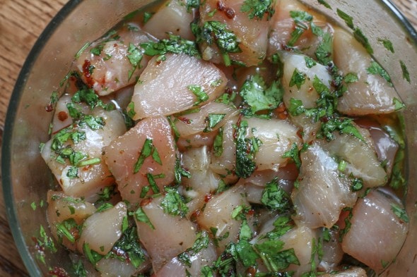 Cut your chicken breasts into 1 1/2 inch pieces and add them to the marinade, mixing well so that all the pieces are nicely coated.