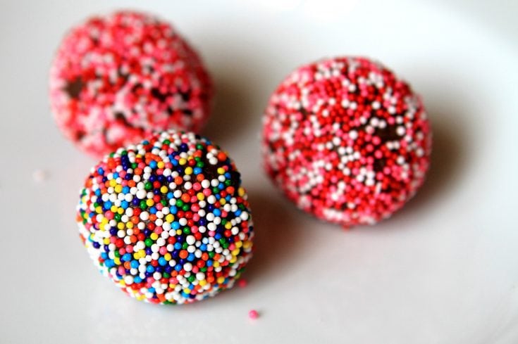 Shape into one-inch balls, and then roll them in any number of coatings. We used colored sprinkles and chocolate jimmies, but the possibilities are pretty endless!