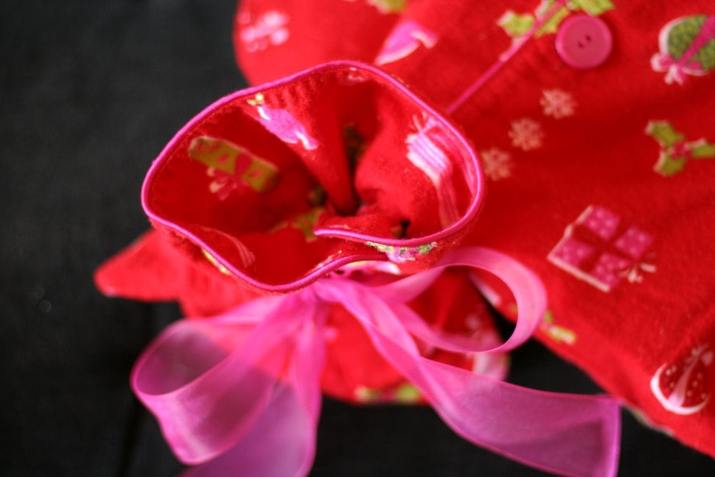 Last year, I made some very colorful gift bags from a pj shirt that we got for free…I think it was from a church clothing exchange or something. Now, my particular tastes run more towards burgundy velvet, or black.