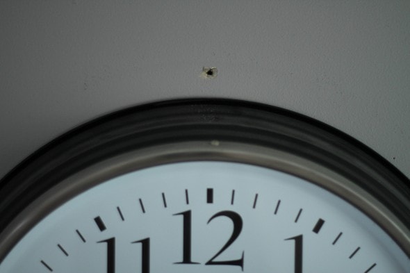 Yeah…when we bought this clock (um, a year ago), we hung it lower than the old clock, and the hole has been exposed ever since.