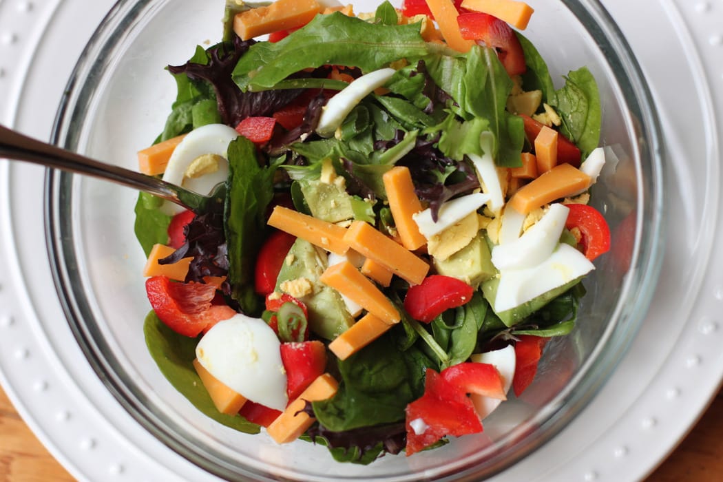 salad made with artisan lettuce, sweet bell peppers, Colby cheese, hard-boiled eggs, and avocados