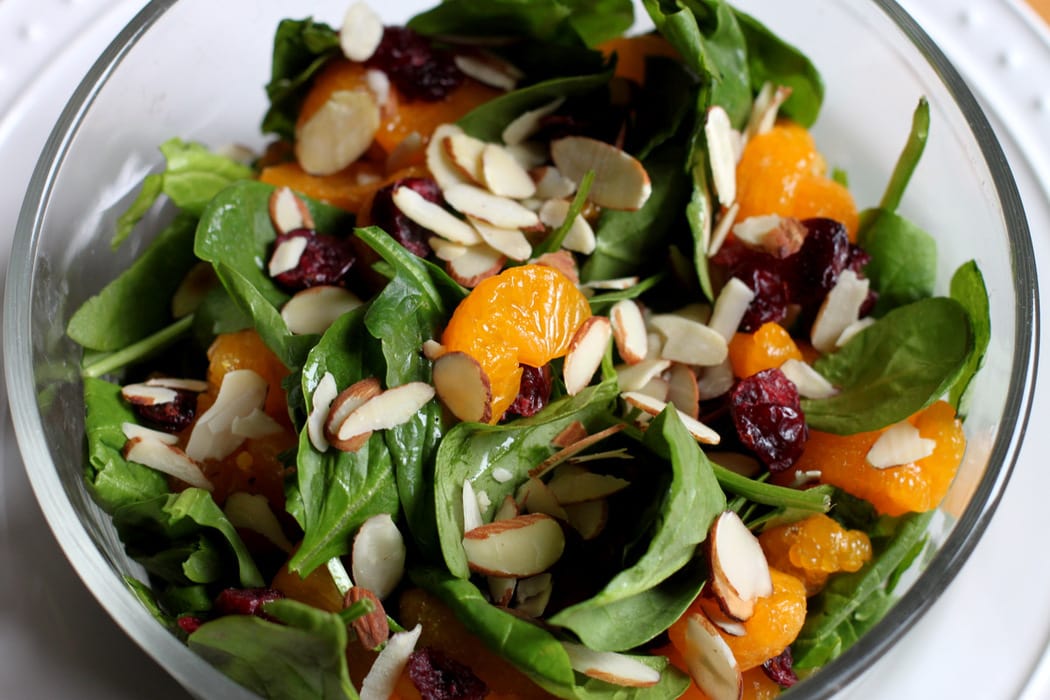 spinach salad with sliced almonds, oranges, and orange-flavored dried cranberries