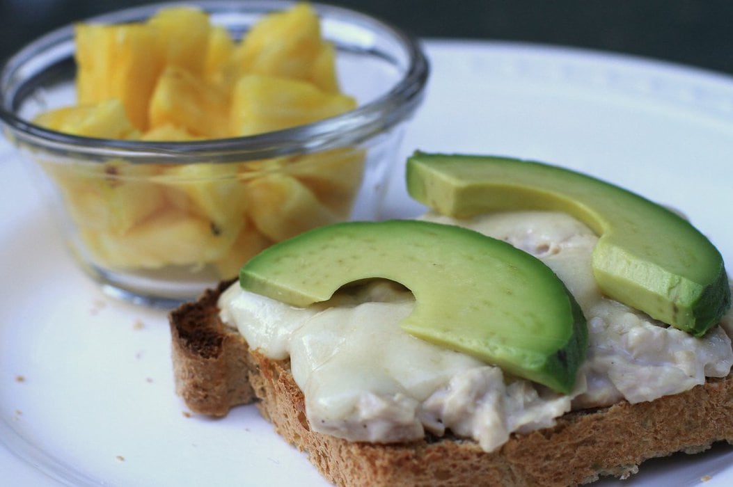 tuna melt made with white tuna, topped with Swiss cheese and avocado