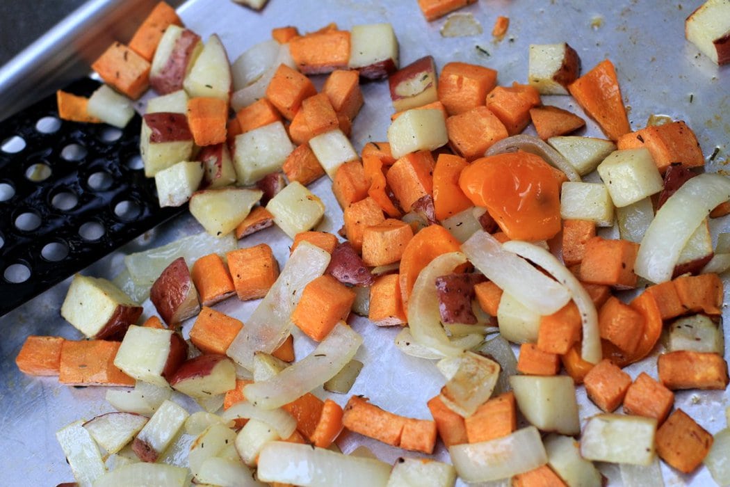 (sweet potato, red potato, and onion, tossed with olive oil, garlic, salt, pepper, and herbs)
