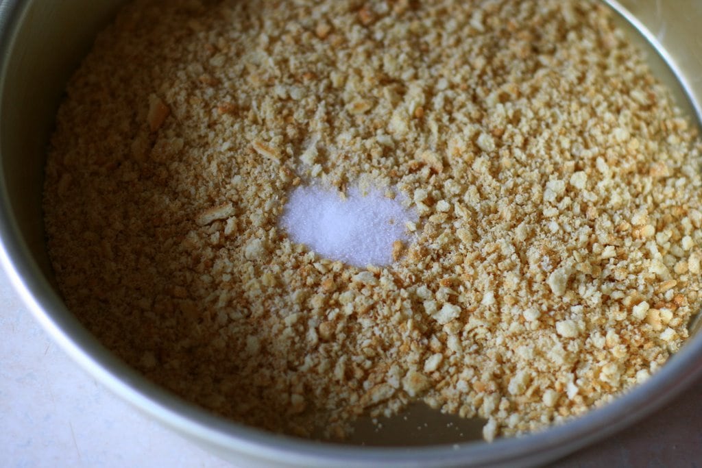 Place the crumbs in a round cake pan or pie plate and add salt.