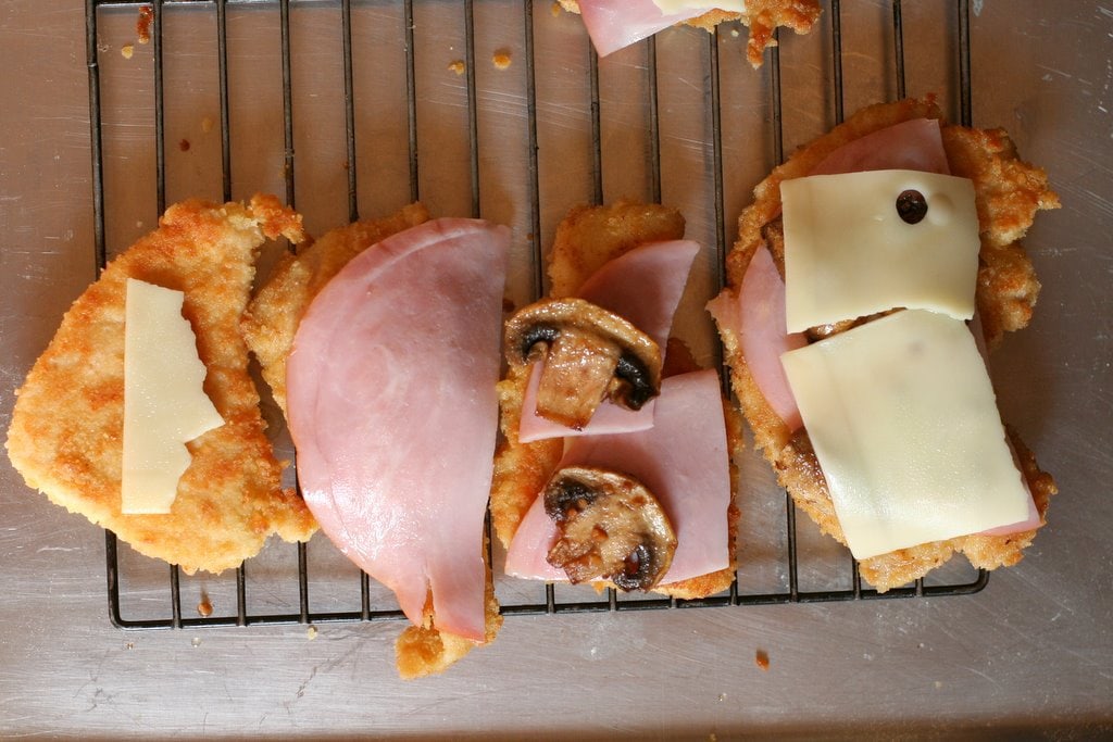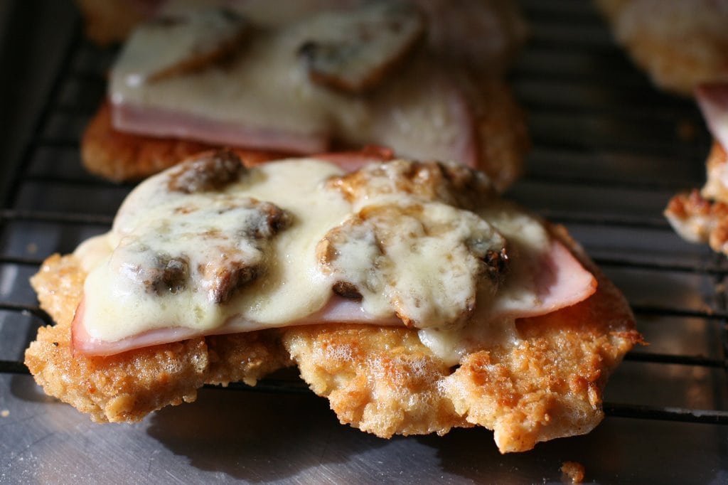 Place a small piece of Swiss cheese on top of the chicken to hold the ham in place, then top it with ham, then mushrooms (or not if you don’t like them!), then more Swiss cheese.