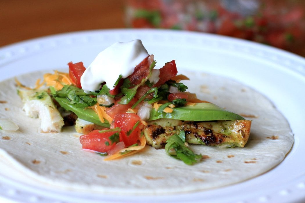 Slice rested chicken into narrow strips and season with salt if desired. Place several strips in the middle of a warmed flour tortilla, and top with cheese, tomato, avocado, sour cream, chopped cilantro, reserved herb paste, or whatever else you wish (I sometimes saute onion slices before I cook the chicken and add those in my tacos).
