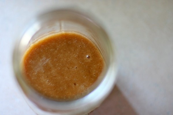 Then with the blender running, you slowly add the oil, which turns the mixture into a slightly thickened, honey-colored dressing.