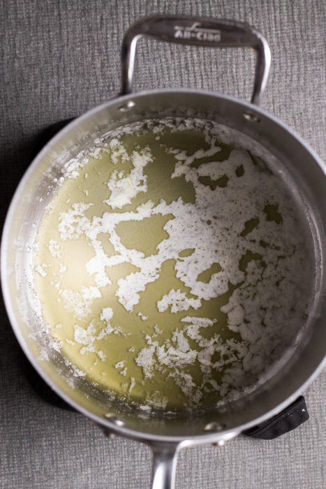 First, preheat your oven to 350°F. Melt 5 tablespoons butter in a saucepan over low heat.