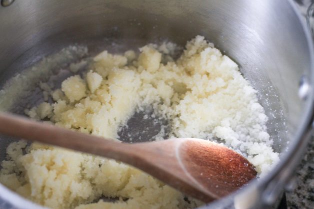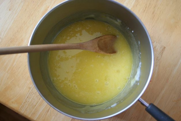 - Melt butter in a saucepan over low heat. Remove pan from heat and stir in sugar (texture will be sandy).