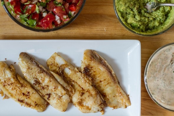 I use tilapia and flour tortillas, top the tacos with guacamole, pico de gallo, and sour cream (my family likes to add cheese too!), and I cook my fish on the stovetop.