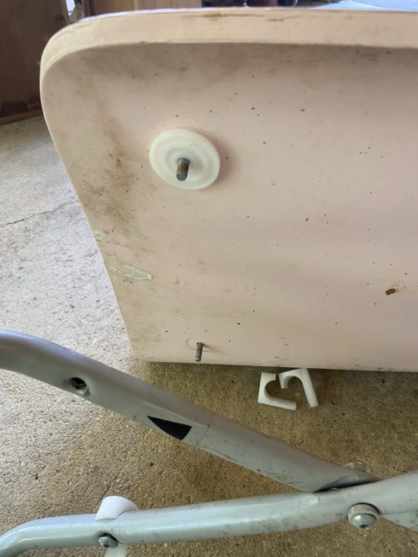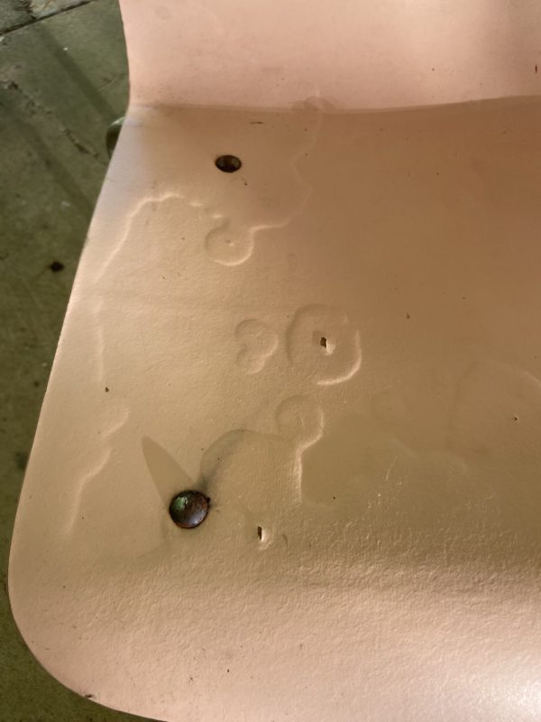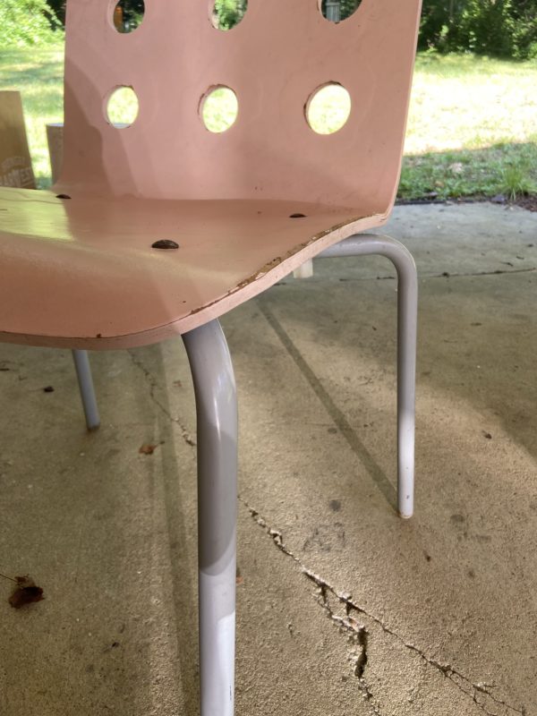 And I can’t find one anywhere that is this pink color, aside from a hot pink rolling desk chair version, so I don’t know…maybe someone painted this one with pink paint?