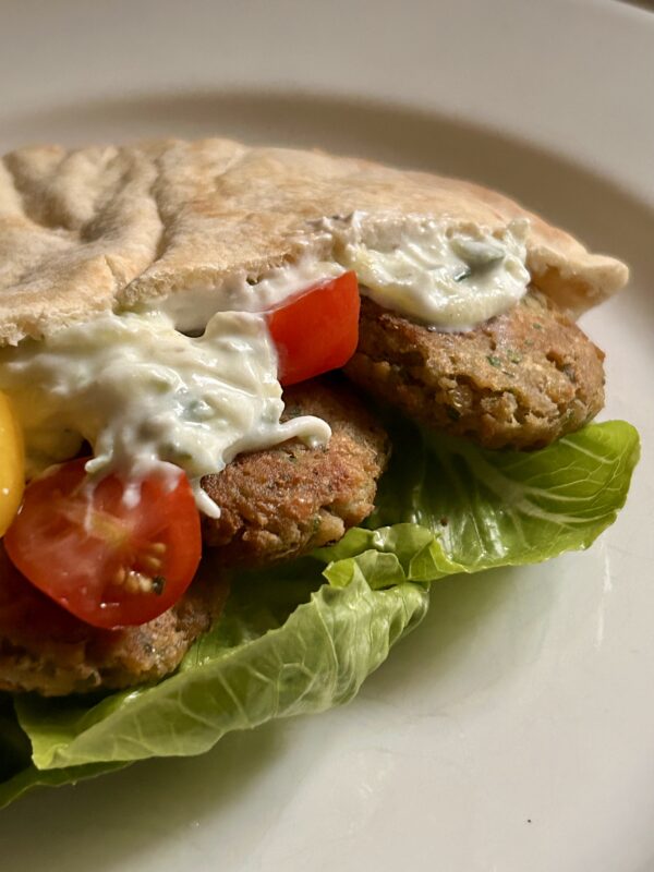 The tzatziki sauce makes a nice salad dressing or dipping sauce, so I sometimes double it. And I just really like a lot of tzatziki sauce in my pitas.